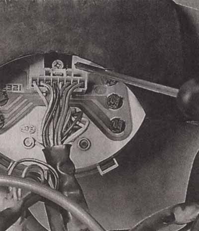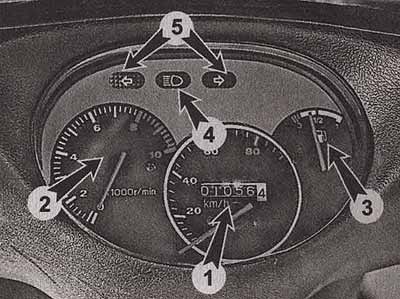 1 — спидометр со встроенным одометром; 2 — тахометр; 3 — указатель уровня топлива; 4 — сигнальная лампа включенного дальнего света; 5 — индикаторные лампы включенного указателя поворота