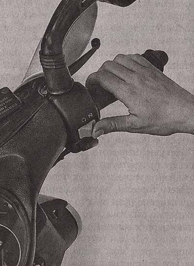 На левой стороне руля обычно расположен рычаг заднего тормоза, переключатель дальнего и ближнего света фары, клавиша включения звукового сигнала и мигания дальним светом (не на всех моделях). Кроме того, здесь находится сдвижная клавиша включения сигналов поворота.