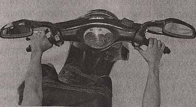 Чтобы проверить состояние подшипников рулевой колонки, устанавливаем скутер на центральную подставку и вывешиваем переднее колесо..