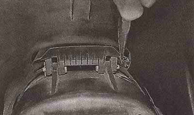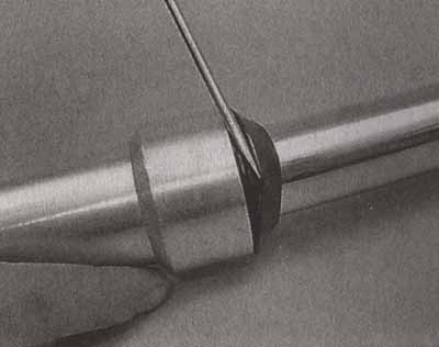 5. Перед установкой также проверяем правильность установки браслетной пружины сальника (она должна «сидеть» точно в своей канавке) и надежность соединения ее концов. Обычно один конец пружины выполнен в виде конуса и ввернут в противоположный конец, образуя пружинное кольцо. Снимаем пружинное кольцо с сальника и немного растягиваем его. При растяжении на 5—10 % кольцо не должно разомкнуться. В противном случае, вворачиваем один конец пружины в другой до обеспечения надежного соединения. Надеваем пружину на сальник.