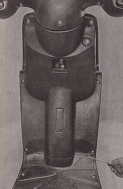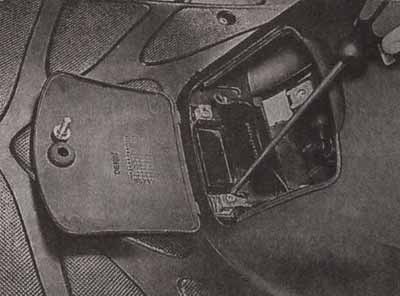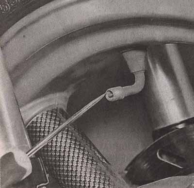 • Устанавливаем скутер на центральную подставку так, чтобы переднее колесо оказалось вывешено. Если скутер не занимает такое положение самостоятельно, можно попросить помощника сесть в седло, чтобы загрузить заднюю часть машины, или просто положить на седло или багажник тяжелый предмет. Главное, чтобы скутер не упал.