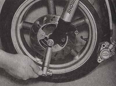 • Пытаемся покачать вилку вперед-назад, взявшись руками за самые концы перьев. Малейший люфт в рулевой колонке — повод сменить подшипники или проверить и отрегулировать их затяжку.
