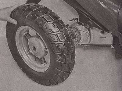 Передние и задние колеса скутеров отличаются, как правило, размерами и конструкцией ступиц: в передних колесах предусмотрено посадочное место под шестерню привода спидометра и дисковый тормоз, в ступицах задних колес находится барабанный тормозной механизм и шлицы, входящие в зацепление со шлицами вала редуктора. Колеса большинства «младших» скутеров имеют диаметр, как правило от 8 до 13 дюймов, на «больших» моделях колеса могут иметь диаметр до 16–17 дюймов. Колеса дешевых моделей, отштампованы под давлением из стального листа, возможно также наличие составной конструкции — диск может разделяться по продольной оси, либо быть сварным. Литые колеса изготавливаются из легких алюминиевых сплавов, не требующих обслуживания и позволяющих использовать бескамерные шины. При всех плюсах литых колес у них есть один существенный недостаток, а именно — необходимость замены в случае повреждения — отремонтировать их невозможно. Не менее важной частью колеса являются шины — именно они воспринимают на себя и гасят, вкупе с амортизаторами, вертикальные колебания скутера. Шины бывают двух типов: камерные, где герметичная надувающаяся камера вставляется внутрь покрышки, и бескамерные. У бескамерной шины покрышка герметично смыкается с ободом колеса. Бескамерные шины завоевывают все большую популярность в силу очевидных достоинств перед камерными шинами. У них меньше масса, большая безопасность при проколе и выше ремонтопригодность. В настоящее время производители шин способны удовлетворить любые потребности авто— и мотопроизводств. Чтобы не запутаться в многообразии моделей, на боковую поверхность шин обязательно наносится маркировка, включающая в себя обширную информацию о целом ряде параметров конкретного типа резины. Самые главные из них — это название производителя и наименование шины, размеры шины (ширина профиля, отношение высоты профиля к ширине в процентах, посадочный диаметр), индекс грузоподъемности и скорости, а также направление вращения. Также в маркировке обязательно присутствует ее тип камерная (tube type) или бескамерная (tubeless).