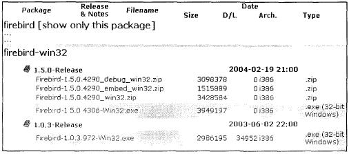 Комплект Firebird можно найти на главном сайте Firebird (http://www.firebirdsql.org) или на сайте SourceForge (http://firebird.sourceforge.net). Ссылки на этих страницах приведут вас к: http://sourceforge.net/project/showfiles.php?group_id=9028. Главная страница на сайте Firebird обычно содержит список ссылок на последние релизы для Linux и Windows. Другие ссылки будут указывать на дистрибутивы для других платформ. Если файл всвоем имени содержит "src", то это созданный исходный код, а не инсталляционный пакет. Дистрибутивы, имеющие в своем имени "debug", "debuginfo" или "pdb", содержат специальные файлы для анализа и отладки сбоев сервера или клиента с помощью сред разработки и не требуются для обычной работы.Содержание комплекта
