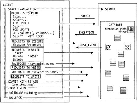 Все задачи пользователей в Firebird помещаются внутрь транзакций. Задача начинается с оператора START TRANSACTION и завершается, когда выполненная работа подтверждается (commit) или отменяется (rollback). Задача пользователя может выполнять множество запросов к операциям в одной транзакции, включая операции с более чем одной базой данных. Работа сохраняется в базе данных в два этапа. На первом этапе изменения сохраняются на диске без изменения состояния базы данных. На втором этапе изменения подтверждаются или отменяются клиентским процессом. В версии 1.5 и выше клиенты могут отменить часть работы, маркируя этапы с помощью точек сохранения (savepoints) и отменяя изменения до точки сохранения без отмены всей транзакции. Транзакции в Firebird являются атомарными в том смысле, что вся работа в рамках транзакции будет сохранена или вся отменена. Транзакции можно конфигурировать с использованием трех уровней изоляции и множества стратегий тонкой настройки параллельности выполнения и условий чтения/записи.Хранимые процедуры и триггеры
