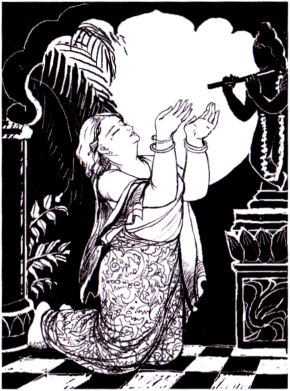 «Однажды Кришна случайно увидел отражение Своего прекрасного тела в драгоценных камнях на полу. Увидев это отражение, Он так выразил свои чувства: «Мне никогда не доводилось видеть ничего прекраснее! Хотя это Я Сам, все же, вслед за Радхарани, Я пытаюсь обнять Свое отражение, чтобы насладиться небесным блаженством!» Рупа Госвами «Лалита-мадхава»