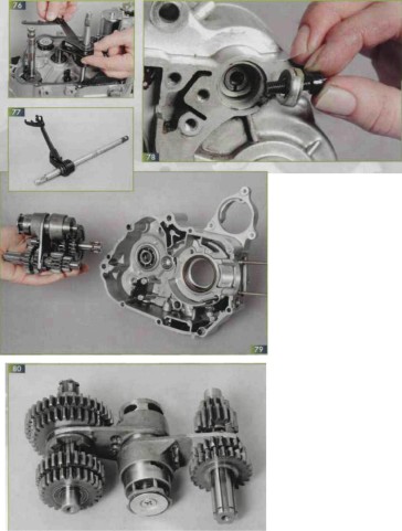 Отворачиваем винт крепления датчика указателя скорости и извлекаем датчик. Шестигранным ключом отворачиваем винт барабана переключения передач. Под винтом расположены контактный элемент и шайба датчика указателя скорости (78). Извлекаем барабан вместе с вилками переключения, валами и шестернями коробки передач (79). При разъединении шестерен, валов и вилок важно не перепутать их местами (80).