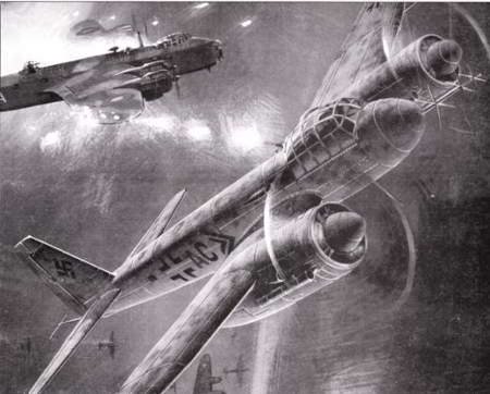 Тяжелый ночной истребитель Ju 88 G-6 из NJG-5 пролетает мимо подбитого британского бомбардировщика Шорт «Стирлинг» в ночном небе Германии, 1944 г.