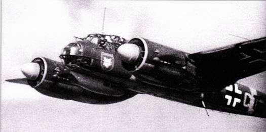 Желтая полней вокруг фюзеляжа обозначает, что самолет действует на Восточном фронте. На снимке – Ju-HHA us 9-го стаффеля 51-й бомбардировочной эскадры. Самолеты этого типа очень широко применялись на Восточном фронте и наносили удары по наземным целям с малых высот.
