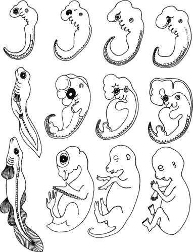 Первую попытку найти механизм, связывающий онтогенез с эволюцией, сделал Фриц Мюллер (Fritz Muller), выпустивший в 1864 г. небольшую книжку под названием «За Дарвина». Мюллер на основе изучения развития ракообразных с позиций Дарвина выдвинул несколько важных идей. Он писал: «Таким образом потомки для достижения новых конечных результатов либо рано или поздно отклоняются в развитии, все еще направленном на повторение формы своих родителей, либо развиваются в этом направлении без отклонений, но затем, вместо того чтобы остановиться, идут дальше». Здесь рассматриваются два способа эволюции. В первом случае потомки проходят только начальный отрезок пути развития своих предков, а затем отклоняются от него, и их дальнейшее развитие протекает по новому пути. Например, можно представить себе, что именно таким образом развитие морских желудей отклонилось от развития других ракообразных. «Во втором случае потомки проходят весь путь развития предков, а поэтому в той мере, в какой возникновение нового вида зависит от этого второго способа продвижения вперед, история развития данного вида будет отражена в индивидуальном развитии его отдельных представителей». В этом случае эволюционный механизм состоит не в замещении прежней взрослой стадии новой, а в добавлении новой стадии. Прежняя взрослая стадия сохраняется, но теперь она представляет собой одну из ступеней индивидуального развития. В результате, в смысле характера развития потомка, - это рекапитуляция. Мюллер понимал, что весь ряд предковых онтогенезов в их полном объеме и во всей их сложности не может рекапитулировать. Какие-то стадии должны уплотняться или выпадать. Таким образом, «летопись событий, происходивших в процессе эволюционного развития, сохранившаяся в истории индивидуального развития, постепенно стирается, по мере того как развитие открывает для себя все более прямой путь от яйца к совершенному животному, но, кроме того, она нередко изменяется в результате борьбы за существование, которую приходится претерпевать свободноживущим личинкам». Идеи Мюллера о рекапитуляции подхватил и разработал Эрнст Геккель (Ernst Haeckel), которому было суждено слить воедино эмбриологию и эволюционное учение. По его представлениям, это должно было дать возможность не только построить надежные филогенетические истории видов, но и объяснить взаимоотношения процессов развития и эволюции. Геккель выдвинул свой знаменитый биогенетический закон в книге «Общая морфология организмов», опубликованной в 1866 г., и возвращался к нему вновь и вновь в своих последующих книгах. Биогенетическим законом Геккель назвал сделанное им обобщение, гласившее, что в онтогенезе данного организма повторяется его эволюционная история, или филогенез. Эта концепция была, в сущности, обновленной версией трансценденталистского закона Меккеля-Серре; она отличалась от своего предшественника, сформулированного проще, главным образом тем, что Геккель представлял себе эволюцию не как единичную цепь живых существ, а как множество дивергирующих линий. По иронии судьбы именно в таком выражении биогенетический закон обладает поверхностным сходством с теми самыми обобщениями, с помощью которых Бэр, как он считал, навсегда разделался с рекапитуляцией. Геккель подвел итог своим представлениям в 1879 г. в книге «Эволюция 