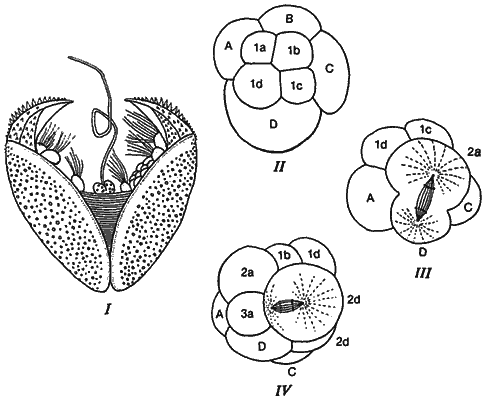 Несмотря на то что концепция архетипа, составляющая часть трансценденталистского подхода к биологии, вряд ли могла привлекать Дарвина и его последователей, она в известной мере продолжала оказывать значительное влияние на интерпретацию эмбриологических данных. Для эволюционистов конца XIX в. ценность эмбриологических данных заключалась в их филогенетическом содержании. Тройной параллелизм Агассица и обобщения Бэра были сформулированы заново в эволюционных терминах. В первом издании «Происхождения видов», вышедшем в 1859 г., Дарвин писал: «...В глазах большинства натуралистов строение зародыша имеет для классификации даже большее значение, чем строение взрослого животного. Зародыш - это животное в его менее измененном состоянии; и тем самым он указывает нам на строение своего прародителя». Существование архетипа здесь так же ясно Дарвину, как оно было ясно Бэру, но, конечно, Дарвин использовал эту идею иначе, чем это делал Бэр, скептически относившийся к эволюции до самой своей смерти (1876). Согласно Дарвину: «Если две или более группы животных, как бы сильно они не различались в настоящее время по строению и образу жизни, проходят через одни и те же или сходные стадии эмбрионального развития, мы можем быть уверены, что они происходят от одной и той же прародительской формы или от почти одинаковых форм и, следовательно, находятся в близком родстве. Таким образом, общность строения зародыша указывает на общность происхождения». Дарвин считал также, что существует рациональное эволюционное объяснение и для тройного параллелизма: «Так как зародыши данного вида или группы видов частично указывают нам на строение их менее измененных отдаленных прародителей, то мы можем понять, почему древние и вымершие формы жизни должны походить на зародышей своих потомков - ныне живущих видов». В полезности такого принципа для выяснения эволюционных взаимоотношений можно убедиться на примере любопытного цикла развития морского желудя. Морские желуди - сидячие формы, заключенные в панцирь и добывающие пищу путем фильтрации воды. Кювье (Cuvier) считал их моллюсками, но после изучения их эмбриологии стало ясно, что морские желуди вовсе не моллюски, а ракообразные. Как и у креветок, у морских желудей первой личиночной стадией служит науплиус. Но этот науплиус, вместо того чтобы, пройдя через дальнейшие личиночные стадии, превратиться в креветкообразную взрослую форму, превращается в циприсовидную личинку, напоминающую остракоду, которая оседает на подходящем субстрате и прикрепляется к нему при помощи цементных желез, расположенных у основания первой пары антенн. Осевшая личинка метаморфизирует, превращаясь в типичного морского желудя (рис. 1-4).