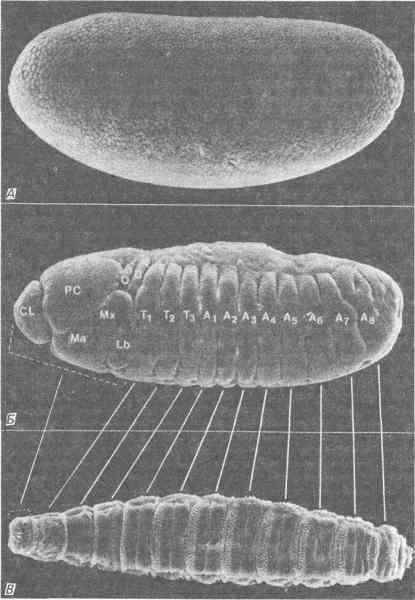 У генов, кодирующих белки хориона, возникают мутации, помогающие выявить функции этих переключающихся генов в морфогенезе. Белки хориона у Drosophila melanogaster кодируются гораздо менее многочисленным семейством генов, чем у шелкопрядов, - в него входит, вероятно, всего 20 генов. Мутация одного из этих генов, недавно рассмотренная Дайган (Digan) и ее сотрудниками, приводит к нарушению морфологии хориона, указывая на то, что по крайней мере один из белков хориона играет какую-то роль в организации его структуры. Гены, кодирующие белки хориона, в сущности, вновь вернули нас к вопросу о числе генов, который рассматривался в предыдущих разделах этой главы. Многочисленность генов, участвующих в сборке одного только хориона, и их сложные переключения позволяют думать, что для многих морфогенетических процессов развития необходима экспрессия большого числа близких генов. Справедливость такого предположения подтверждается примерами гистонов, тубулинов, актинов и других белков, синтезируемых зародышами. После того как эти белки, прежде считавшиеся продуктами одного или самое большее нескольких генов, были изучены более подробно, стало очевидно, что их появление в процессе развития на самом деле обеспечивается целыми семействами структурно близких и функционально координированных генов. Для развития необходима экспрессия большого числа структурных генов. Многие регулируемые в процессе развития структурные гены принадлежат к семействам эволюционно близких генов, возникшим от одного предкового гена путем дупликации и дивергенции. Близкие многочисленные гены создают возможность для тонкой настройки экспрессии структурных генов, с тем чтобы отдельные гены экспрессировались в течение строго определенных периодов развития или в определенных группах клеток. Так, например, все β-глобины выполняют в общем, в зародыше и во взрослом организме, одну и ту же функцию, но делают это несколько разными способами и с различной эффективностью. Мультигенные семейства наделяют организмы эволюционной пластичностью, так что изменение сроков или места экспрессии одного из членов такого семейства не влияет на экспрессию других его членов. Возможно, что таким образом облегчается диссоциация процессов развития в эволюции.