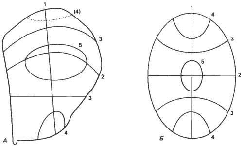 Рис. 2-2. Четыре представителя иглокожих из нижнего палеозоя (Durham, Carter, 1963; Parsley, Mintz, 1975; Ubaghs, 1971; MacBride, Spencer, 1938). А. Геликоплакоидея. Б. Паракриноидея. В. Стилофора. Г. Примитивная эхиноидея. Все эти формы были построены из кальцитных пластинок и обладали амбулакральной системой. В остальном они сильно различались как по типу симметрии, так и по общему строению. У геликоплакоидеи имелся спирально закрученный амбулакральный канал; у паракриноидеи - два таких канала, снабженные ножками; у стилофоры - один канал, проходящий по ее «руке», а у эхиноидеи - пять каналов.