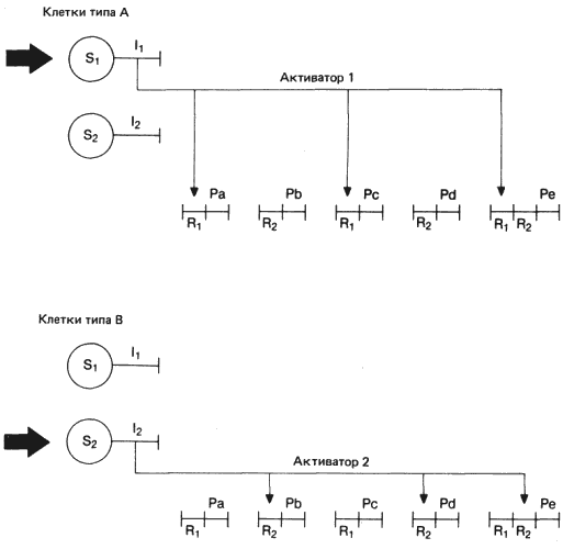 Рис. 12-2. Функции тканевой интегрирующей системы, регулирующей характер экспрессии батарей генов в клетках двух разных типов. Толстыми стрелками показаны индукционные или гормональные сигналы, поступающие в клетку извне. Эти сигналы вступают во взаимодействие с соответствующим сенсором, активируя определенный ген-интегратор. Продукт этого гена взаимодействует со специфическими регуляторными генами (R), примыкающими к структурным генам (Р). (Схема основана на модели Бриттена и Дэвидсона.)