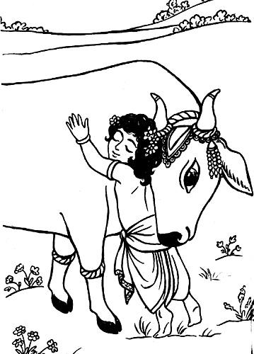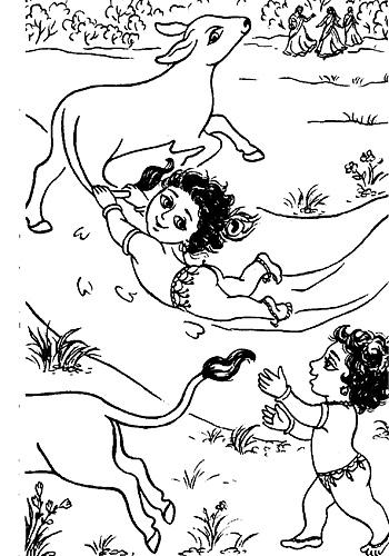 Однажды Кришна и Баларама, ползая по грязи, увидели двух спящих телят и схватились за их хвосты. Телята очень испугались, удивились и бросились бежать. Они бежали быстро, а Кришна и Баларама, вцепившись в их хвосты, волоклись за ними по жидкой грязи и навозу. Они плакали от испуга и еще больше пугали телят, которые и так мчались изо всех сил. Яшода и Рохини и все остальные гопи побросали все свои дела и побежали любоваться этой замечательной лилой. Они смеялись, а некоторые гопи дразнили Кришну и Балараму: «Посмотрите, это же маленькие, глупые телята, которые еще сосут молоко своей матери, а Вы не можете с ними совладать». В конце концов гопи удалось оторвать Их от телят и вернуть Яшоде и Рохини.