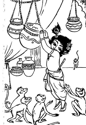 Одна гопи жаловалась, что как-то раз Кришна пришел и, прежде чем есть масло, собрал полный дом обезьян и стал кормить их маслом, разбрасывая его повсюду. И Он был так счастлив! Наевшись, обезьяны разбежались, и Гопал стал ругать их: «Вы куда? Я еще не поел. Одному есть скучно. Возвращайтесь, будем есть вместе! Без вас Я есть не буду!» Но поскольку обезьяны разбежались, Гопал так рассердился, что разбил все горшки с маслом и ушел.