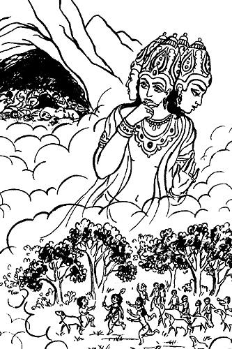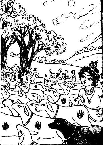 А иногда сами пастухи играли с Кришной. Они указывали на Его голову или руку и просили: «Гопал, покажи, где Твоя голова? Гопал, а теперь покажи руку». И Гопал показывал.