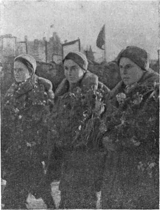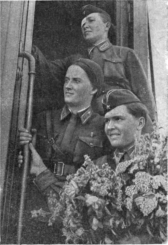 …За день до приближения поезда к Москве появились чисто женские хозяйственные заботы. Полина первая, а за ней и мы с Валей принялись стирать и очень тщательно гладить наши шелковые блузки, чистить и приводить в порядок замшевые костюмы. Занимались всем этим с каким-то особым воодушевлением. На последней станции перед Москвой — в Александрове — в вагон сели представители кинохроники. От них мы узнали, что в Москве по случаю нашего приезда будет митинг, потом мы поедем к товарищу Сталину. Мы с Полиной моментально бросились в купе к Вале. Она отдыхала. Мы начали ее тормошить: — Валя, Валя! Вставай скорей! Мы в Москве поедем к Сталину! Мы были очень взволнованы. Полина все время приставала: — Завяжи мне получше галстук! Надевали галстуки, десятки раз поправляли шапки, по многу раз оглядывали друг друга. Задолго до Москвы мы уже вылезли в тамбур и выглядывали с нетерпением, скоро ли наша родная Москва. Но вот поезд подходит к Москве. Вдоль железнодорожного полотна из всех домов, из всех окон нам машут люди, а мы в нетерпении открываем двери тамбура и чуть не висим на подножках. Нас все время тянут обратно в вагон, но где там! — ведь через несколько минут мы увидим своих ребят и своих родных. Вокзал. Очищен перрон, стоит караул. На соседней платформе много народа. А на нашей — совсем небольшая кучка людей. Это, наверное, наши родные. Мы готовы прыгать из вагона на ходу. Поезд подходит. Выскакиваем. Ничего нельзя разобрать. Все целуются с кем попало. Ко мне подбегают моя дочка, мама, брат, племянник. Подходит М. М. Каганович, Локтионов, Герои Советского Союза. В руках у нас оказываются громадные букеты цветов. Торжественный митинг на вокзальной площади. Много и тепло говорит Лазарь Моисеевич Каганович, и мы горды, что нас приветствует от имени Центрального Комитета партии и Совнаркома СССР Лазарь Моисеевич, боевой соратник и друг товарища Сталина. Во время митинга Танюша непрерывно меня тормошит: — А где белка? А почему ты белку не взяла с собой из вагона? С другой стороны племянник дергает за рукав и ощупывает мою кожанку. Валя Гризодубова держит на руках Соколика. Соколик сидит тихо и смотрит на меня лукавыми глазами. Он очень рад, что приехала его мама. Тут же, на трибуне, стоят наши родные. Как хорошо в Москве! Митинг заканчивается. Садимся со своими родными в украшенные цветами открытые машины и едем по улице Горького. На тротуарах по обе стороны множество людей. Они машут, кричат. У меня подступает какой-то комок к горлу. Первый раз в жизни я так приезжаю в Москву. Так же приезжали челюскинцы, полюсники, так же встречали Громова, Чкалова. Но самой переживать это невозможно. Мы не замечаем, как машины подлетают к площади Пушкина. Сверху на нас сыплется форменный дождь из листовок. Их туча — белых, красных, всех цветов. Как будто вихрь несется по улице. Моя дочка старается наловить побольше этих листовок и напихивает их в карманы бабушке, мне, себе, куда только возможно. Машина мчится. Кругом вихрь. Люди кричат, машут. Хочется каждому помахать, ответить, каждому улыбнуться. На передней машине едет Валя, потом Полина, наша машина третья. Все узнают, называют по именам, громко кричат и рукоплещут. Немеют руки, но мы все машем и машем: привет Москве и москвичам! Здравствуйте! Дорога сплошь усыпана цветами и листовками. Вот машины проносятся мимо переулка, в ко