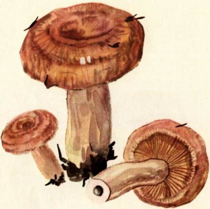 Растет этот гриб с конца июля до октября в лиственных, преимущественно березовых и смешанных лесах. Его шляпка плотная, мясистая, сначала плоская, у более старых грибов на ней образуется воронковидное углубление. Диаметр шляпки достигает 15-17 сантиметров. Цвет ее буро-оливковый с черными кругами. Мякоть гриба плотная, сероватобелая. На изломе выделяет обильный едкий млечный сок, который потом чернеет. Пластинки тонкие, частые, сероватые. Ножка зеленовато-бурая, плотная и короткая. Чернушка хороша для соления. Следует иметь в виду, что при солении этот гриб изменяет цвет: вначале становится фиолетовым, затем темно-вишневым.Волнушка розовая – Lactarius torminosus Fr