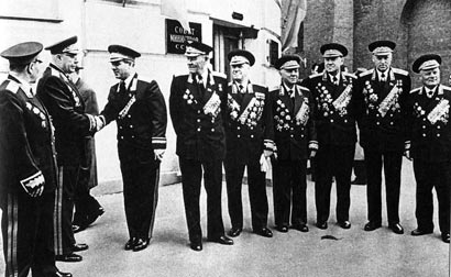 Генерал-полковник Семичастный представляется маршалам. Слева направо: С.М.Буденный, С.К.Тимошенко, В.Е.Семичастный, К.А.Вершинин, Г.К.Жуков, К.Е.Ворошилов, М.В.Захаров, К.К.Рокоссовский, Ф.И.Голиков. 9 мая 1965