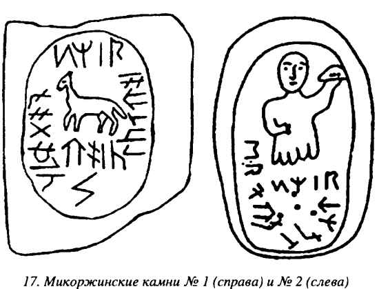 Камень № 1 – четырехугольной формы, с закругленными углами. В центре овала изображена фигура человека, держащего в левой руке предмет (возможно, камень) треугольной формы. «Внутри» двустрочной надписи «чертами и резами» заключено изображение созвездия Тельца. Микоржинский камень № 2 – тоже четурехугольный и с закругленными углами. В центре овала нарисована фигурка лошади. Надпись нанесена по внутреннему периметру овала, причём первое слово на камне № 2 совпадает с первым словом на камне № 1. Наиболее связную и не расходящуюся с изображениями расшифровку обеих надписей сделал в 1991 г. Г. Гриневич, полагая, что они выполнены слоговым древнеславянским письмом «на западном (польском?) наречии общеславянского языка, а точнее, на древнепольском (?) языке». Тех, кто желает знать, как это сделал Гриневич, отсылаю к его книге «Праславянская письменность. Результаты дешифровки» (М., 1993. С. 68–71). Текст на камне № 1 (с человеком), по мнению Гриневич, читается так: «РОСИЙА МОЙА МЕШĚНЬ ЙУНЬСИ», что переводится на современный русский язык (учитывая, что «Йуньси» или «Юньць» – это, согласно словарю Срезневского, древнеславянское название созвездия Тельца): «РОСИЯ. МОЯ МЕТА (мой знак) ТЕЛЕЦ». Текст на камне № 2 (с лошадкой) Гриневич расшифровывает следующим образом: «РОСИЙА НА НИЗО БĚ ПОЛЕ РОЩĚНИ И ЛОГИ ЛОЙУШНАИ», а в русском переводе (учитывая, что, по Срезневскому, «лои» – это сало, жир, мускулы): «РОСИЯ. НА НИЗУ БЫЛИ ПОЛЯ, РОЩИ И ЛОГА ОБИЛЬНЫЕ». Остается только гадать, что, по мнению автора надписи, было «Низом» – низовья Днепра (как полагает Гриневич) или низовья Вислы. В принципе, поля, рощи и лога есть и тут, и там, только в низовьях Вислы рощи погуще, а лога поменьше. Но, как бы там ни было, слово «Росия» на обнаруженных в Центральной Польше камнях нас не должно удивлять, поскольку еще в XVI в. н. э. польские историки считали, что Польша, Литва и Жемайтия – это тоже Русь (М. Стрыйковский). Территорию же современной Южной Польши в начале I тысячелетия от Р. Х. занимала «группа Пшеворск», откуда, по мнению археолога К. Вердиани (1951), предки словен пришли на Новгородчину во II–III вв. от Р. Х. В группе Пшеворск, на основании имеющихся находок, можно распознать ощутимое влияние кельтов. Они во II в. до н. э. действительно вторглись на эту территорию через Моравские ворота и длительное время сохранялись здесь в виде небольшой, но влиятельной прослойки. Кельты компактно селились лишь в Силезии, однако уже в I в. н. э. растворились среди местного населения. Из этой культурной общности формировались предки поляков, которых немецкие соседи до сих пор называют «лехи» («Lechen»), а украинские – «ляхи», т. е. «влахи», что являлось одним из обобщающих названий кельтов. Так кельтский элемент оставил след в названии современного польского народа и, возможно, в названии реки Волхов на Новгородчине и слове волхв (языческий жрец). Немецкая же историческая школа, как водится, относит группу Оксиве к бургундцам, а группу Пшеворск к вандалам. Это уж даже неинтересно… После переселения народов периода Культуры полей погребальных урн несколько культурных групп зарождаются на территории современных Чехии и Моравии. В V в. до н. э. на эти территории проникают кельты и насаждают свою культуру типа Латен. Территория современной Австрии, Баварии, Швабии и Восточной Швейцарии была полностью завоевана и