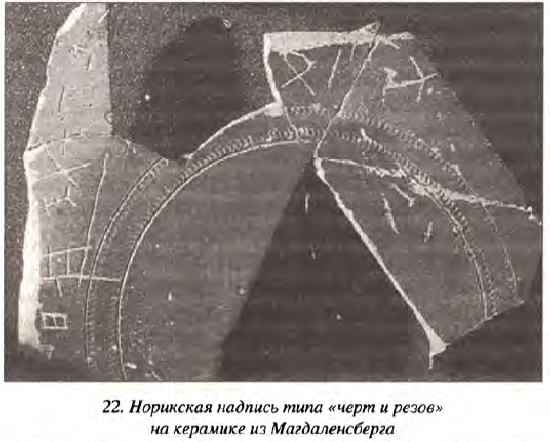 В 1977 г. произошло событие, которое почему-то не привлекло внимания наших историков и лингвистов. В гравиевом карьере австрийского городка Графенштайн был найден обломок керамики II века новой эры с норикской надписью (см. илл. 11).