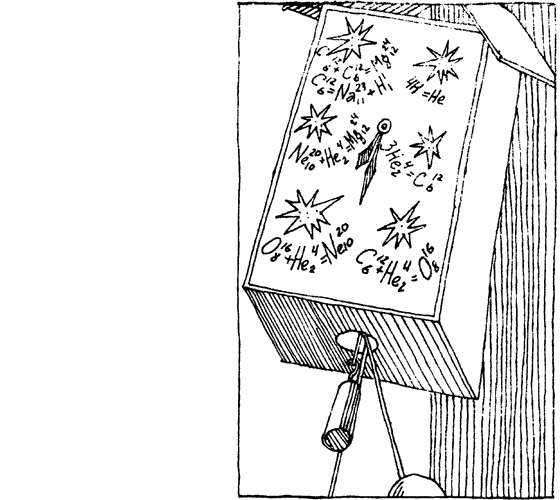 Науке точно известны условия, при которых в звездах происходит слияние ядер водорода с образованием ядер гелия. Условия эти выражаются тремя словами: 20 миллионов градусов. Кратко, но… очень сложно. Сложно потому, что извилистым и подчас изнурительным путем пришли ученые к выяснению этой величины. Сложно потому, что нелегко было доказать и исчезновение водорода, и образование гелия. Сложно потому, что 20 миллионов градусов — это все-таки громадная, чудовищная температура. И надо было обладать незаурядной по тому времени научной смелостью, чтобы предположить возможность существования таких температур, и добротной научной эрудицией, чтобы доказать справедливость этих предположений. 20 миллионов градусов! Много? Очень много. Тем не менее очень скоро мы поведем речь о таких температурах, по отношению к которым 20 миллионов градусов — то же, что студеная вода горного потока в сравнении с кипящим маслом. Итак, выгорает на звезде водород. Он не горит, конечно, в прямом смысле этого слова. Горение — процесс соединения элементов с кислородом. Вот почему «выгорает» — сказано здесь не совсем точно, но, по-видимому, достаточно образно. В звезде образуется гелиевое ядро. При этом гелий оказывается сильно сжатым по сравнению с исходным водородом. Оболочка звезды — небольшое количество оставшегося водорода — напротив, сильно расширяется. Что же при этом происходит? А то же, что в нашем домашнем холодильнике. Расширение фреона в испарительной камере сопровождается охлаждением газа, ожижение фреона приводит к выделению тепла, к разогреванию. Таких «холодильников» во Вселенной столько, «сколько звезд на небе». Вероятно, эта поговорка никогда не была так к месту. Потому что здесь ее следует понимать буквально. Каждая звезда — «холодильник» с «холодильной камерой» — оболочкой и «поршневой камерой» — ядром. Вот почему в гелиевом ядре температура сильно повышается, а водородная оболочка звезды значительно остывает. Это слово надо понимать, конечно, относительно. Водородная оболочка имеет температуру 3000–4000 градусов; при такой температуре не озябнешь! Тут, разумеется, возникает вопрос: как об этом узнали? Как раз это оказалось сравнительно несложным. Обратили внимание на то, что те звезды, в которых мало водорода, но много гелия, имеют на поверхности более низкую температуру. Определять температуру звезд, хотя и не очень простая, но, в общем, вполне посильная задача: чем белее звезда, тем она жарче разогрета, чем краснее, тем она холоднее. (Вспомните: «Нагреть до белого каления».) В гелиевом ядре таких звезд возникают условия, которые по нашим, земным, меркам и представить трудно: температура 100–150 миллионов градусов. (Лишнее подтверждение справедливости французской пословицы: «Всякое сравнение хромает». Вспомните сравнение, которое я приводил несколькими строками ранее; как видим, «масло» нагрето сильнее «воды» на сотню с лишним миллионов градусов…) Плотность вещества, образующего гелиевые звезды — несколько центнеров на кубический сантиметр. Плотность хорошая — такая, что одна щепоть этого звездного вещества потянула бы столько, сколько хорошо груженный КамАЗ. Вот при таких условиях становится возможной реакция: