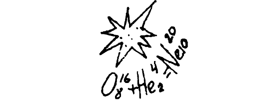 342He = 126C.Из трех ядер гелия образуется одно ядро углерода. Эта реакция может идти и при «прохладной» температуре — доказательством служит то, что углерод обнаружен на Солнце. Но при такой низкой (сравнительно, конечно) температуре, как на нашем светиле, реакция образования углерода идет очень медленно; поэтому этого элемента так мало на Солнце. А вот при 150 миллионах градусов образование углерода протекает очень быстро. Проходит каких-нибудь 10–100 миллионов лет — и гелия на звезде нет или, вернее, почти нет: выгорел. «Дым» при этом «горении» получается очень увесистый. Дело в том, что при такой чудовищной температуре, которая повышается по мере выгорания гелия, образовавшийся углерод продолжает присоединять ядра атомов гелия. При этом происходит ряд последовательных реакций: 126C + 42He = 168O — образуется кислород; 168O + 42He = 2010Ne — образуется неон; 2010Ne + 42He = 2412Mg — образуется магний. Астрономам известно несколько звезд, которые преимущественно состоят из магния. Так что приведенные уравнения ядерных процессов — отнюдь не досужий вымысел. Из водорода — магний! Такое значительное увеличение атомного веса химических элементов, образующих звезду, не проходит для нее бесследно. Центральная область ее продолжает уплотняться, сжиматься. Температура звезды при этом, конечно, возрастает. Сейчас она выражается уже совершенно немыслимой величиной: 3 миллиарда градусов! При такой температуре возможны самые неожиданные процессы. Начинают соединяться друг с другом ядра углерода: