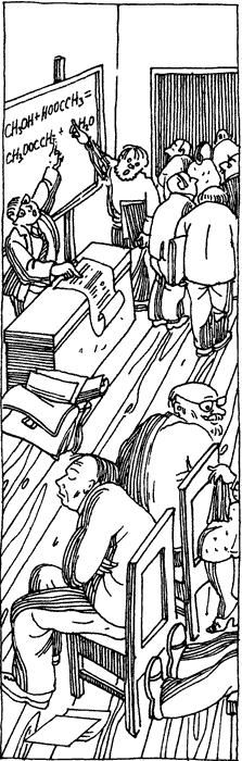 Пожилые профессора, поднаторевшие во всякого рода заседаниях и дискуссиях, знали: если начинается спор о реакции этерификации, можно уходить. Вот почему, когда после очередного научного доклада кто-нибудь из сотрудников произносил сакраментальное выражение «механизм реакции этерификации», добрая половина аудитории покидала свои места и направлялась к выходу. При этом на лицах выходящих было написано: «И охота же людям терять время попусту!» Да, пожилые профессора были умудрены жизненным опытом. Они знали, что вот эти самые молодые люди, которые спорят сейчас у доски, невежливо выхватывая друг у друга мел, разойдутся нескоро. А решение вопроса так и останется за семью замками. Добро бы еще за семью! С семью замками справиться можно: к иным подобрать ключ, к другим — отмычки, третьи и вовсе сломать. А здесь этих замков — не сосчитать. Нет, уж лучше держаться подальше от реакции этерификации. Самым обидным было, что скептики оказывались неизменно правыми. Спустя часа три участники очередной дискуссии расходились охрипшие и злые. Злые друг на друга, на самих себя, на природу, которая не оставила даже узенькой лазейки, чтобы помочь разобраться в том, как все же протекает эта реакция этерификации. И была бы тайна как тайна! Скажем, как Тунгусский метеорит или чудище из шотландского озера Лох-Несс. Так нет же, реакция, подобная тысяче других. И все же загадочная. Тут придется от лирических восклицаний перейти к существу дела. Придется написать уравнение химической реакции. И даже не одно. Допускаю, что химические уравнения не повышают интереса к книге. Но ведь это все же научно (научно!) — художественная книга, а не «Похождения Нила Кручинина». Поэтому уравнения я приведу — и для того, чтобы было ясно, о чем, собственно, идет речь, и для того, чтобы было над чем поразмыслить. Вот она, эта реакция этерификации. Собственно, реакций этерификации может быть великое множество. Взаимодействие любого спирта с любой кислотой — реакция этерификации. Хотя бы метилового спирта с уксусной кислотой: