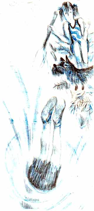 Когда круги перед глазами исчезли, а звон в ушах прекратился, Борис обнаружил, что Мартышки на плоту нет. Она болталась в воде возле плота, придерживаясь за него руками. — Я ду… ма… ла… ты упал… — сказала Мартышка, дыша так же часто и отрывисто, как Борис. Она часто моргала, и то, что текло по ее щекам, было очень похоже на слезы. Веника на плоту тоже не было. Когда рюкзак, а за ним Борис и Мартышка плюхнулись в воду, Веник решил, что это уже слишком. Он прыгнул вслед за ними, но тут же раскаялся: ноги его болтались в воде, не ощущая привычной опоры, и он чувствовал себя беспомощным. Как и все собаки, плавать он умел от рождения, но это открытие ничуть его не обрадовало. Он и сам не знал, зачем прыгнул в эту жидкую, мокрую и холодную воду. На поверхности от Веника оставались только кусочек хвоста и голова с ушами, торчащими словно малярные кисти. Увидев Бориса, он подплыл к нему и попытался на него взобраться, положив передние ноги на его плечи. Впрочем, можно было подумать, что Веник приступил к спасательной операции. Стряхнув собаку, Борис уцепился за плот рядом с Мартышкой. — Упустил… — сообщил он. — Чуть бы пораньше… — Ты нарочно нырнул? — Неужели нечаянно… — Что же теперь делать? — Будем помирать. Лжедмитриевна протянула Борису руку. — Влезай. Я тебе помогу. Борис презрительно фыркнул в воду, нырнул под плот и вынырнул с другой стороны. За время всей этой возни их снесло назад. Упущенные весла болтались недалеко от плота: их сносило медленнее. Борис поплыл за ними. На том берегу все это видели, хотя и не понимали, в чем дело. К плоту уже плыли трое. Когда Борис прибуксировал весла, можно было различить Стасика, Гену и Чижика. Борис закинул весла на плот. — Давай влезать одновременно, — сказал он Мартышке. — По счету три. Раз… Борис и Мартышка с противоположных бортов, дрыгая ногами, втянули на плот по половинке туловища. Веник заскулил. Он не то чтобы твердо решил, что его бросают: это было бы стопроцентным предательством в таком положении, — он просто напоминал, что есть на свете такая собака Веник, которой не хотелось бы оставаться одной среди такого обширного и такого мокрого пространства. Мартышка помогла Венику взобраться на бревна. Он тут же отряхнулся. Когда Веник вытряхивал последнюю мелкую водяную пыль, около него возникло радужное облако. Лжедмитриевна получила свою порцию душа. Ее это не огорчило, а Бориса не порадовало, что непременно произошло бы в другой обстановке: сейчас было не до мелкой мести. Подплывшие ребята окружили плот, ухватились за него. — Вы что тут кувыркаетесь? — спросил Стасик. — Рюкзак упал, — сообщила Мартышка. — Какой? — С продуктами. — Поймали? Вопрос был излишним: все видели, что на плоту оставался только один рюкзак. Однако для подобного разбирательства место было не совсем подходящим. Плот продолжало сносить. Борис и Мартышка начали понемногу синеть, кожа их покрывалась пупырышками. И только Лжедмитриевна сидела неподвижно. Правда, на ребят она не смотрела, и можно было подумать, что она тоже переживает. — Гребите, — сказал Стасик, — мы вас будем подталкивать. Прежде чем Мартышка взяла весло, его неожиданно перехватила Лжедмитриевна. Совесть ее, что ли, заела или что-то другое — Борис не понял. Но, как и обычно, ничего хорошего из этого не получилось. Лжедмитриевна гребла, а неподвижная Мартышка мерзла все б