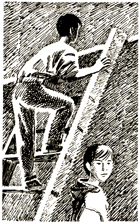 Ты осматриваешь стойло. И вдруг замечаешь какой-то небольшой предмет, вделанный в стену. Он напоминает маленький карманный фонарик. — Наверно, это электронный глазок! — говоришь ты. — Послушай! — сердится Джеф. — Давай лучше все хорошенько осмотрим, пока никого нет. Мне не терпится узнать, что там, на сеновале. — Он смотрит на лестницу, которая ведет на сеновал. Вы входите, прикрыв за собой дверь. Ты думал, что магнитофон опять включится, но ничего не слышно, кроме щебетания птиц в клетке. Джеф забирается по лестнице на сеновал. — Ой, ты только взгляни, здесь полно всяких штуковин, — зовет он тебя.Открой страницу 96.*(обратно)