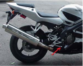 поз.5 — датчик температуры охлаждающей жидкости (на некоторых мотоциклах — датчик топлива); поз.6 — резервуар с тормозной жидкостью для переднего тормоза; поз.7 — кнопка экстренного выключения зажигания;поз.8 — рычаг переднего тормоза; поз.9 — ручка газа; поз.10 — кнопка стартера; поз.11 — кнопка звукового сигнала;поз.12 — болты настройки переднейподвески (ниппеля подкачки передней вилки) (категорически не рекомендуется трогать их самому); поз.13 — кнопка моргания фарой (на рисунке ее не видно, так как она расположена с другой стороны пульта); поз.14 — рычаг обогатителя «Choke» («подсос») (на инжекторных мотоциклах его нет, а на некоторых мотоциклах «подсос» расположен слева под бензобаком, рядом с краником): необходим для холодного пуска двигателя (т. е. когда у мотоцикла холодный двигатель) — смело тянем его на себя, заводим и ждем пока температура достигнет половины шкалы, потом его убираем от себя и едем; поз.15 — переключатель ближний / дальний свет; поз.16 — переключатель поворотов — для того чтобы выключить поворот просто достаточно утопить его вглубь; поз.17 — окошко уровня тормозной жидкости (на большинстве моделей стоит пластиковый бачок); иногда сцепление тоже бывает гидравлическим — тогда бачок будет и с левой стороны тоже; поз.18 — индикатор давления масла в двигателе — на холодном мотоцикле всегда горит, но должен погаснуть через несколько секунд после того, как заведен двигатель (на некоторых мотоциклах так же «сообщает» о низком уровне масла); поз.19 — индикатор нейтрали; поз.20 — индикатор поворота; поз.21 — лампа индикации включения дальнего света фары; поз.22 — рычаг включения / выключения фар и габаритных огней. Данный пример рассмотрен на базе мотоцикла HONDA и в других марках и моделях могут быть различия. Но основное что надо помнить — расположение рычагов сцепления, переднего тормоза и ручки газа — на всех современных байках одинаково!!! И не перепутайте сцепление с тормозом!!! ☺ Заднее колесо приводится в движение (в большинстве случаев) при помощи цепи. Так же имеются мотоциклы с карданным и ременным приводами. Коробка передач может быть 4- х, 5- ти и 6- ти ступенчатой с нейтралкой, расположенной между 1- й и 2 — й скоростями. Некоторые спортивные мотоциклы так же имеют нейтралку между 5 — й и 6 — й скоростями. Рычаг переключения скоростей расположен с левой стороны мотоцикла (рис.2), а с правой стороны находится педаль заднего тормоза (рис.3)