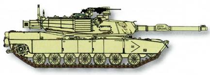 Танк М1А1 Боевая масса, т: 57,15. Экипаж, чел.: 4. Габаритные размеры, мм: длина – 9828, ширина – 3657, высота – 2438, клиренс – 432. Бронирование, мм: лоб корпуса – 50…125, борт – 25…60, днище -12,7…32, башня-25…125. Скорость макс., км/ч: 66,7. Двигатель: AGT-1500, газотурбинный, трехвальный, с двухкаскадным осецентробежным компрессором. Максимальная температура газа в турбине -1193 °С. Трансмиссия: Allison Х-1100-ЗВ, однореакторная комплексная гидропередача с блокировочным фрикционом, четырехступенчатая планетарная коробка передач, дифференциальный двухпоточный механизм поворота с гидрообъемным приводом управления и две бортовые передачи. Средства связи: радиостанция AN/VRC-12, переговорное устройство AN/VIC-1. Запас хода, км: 465.