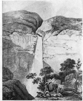 Водопад на Рио-де-Винагре поблизости от вулкана Пурасе. (По рисунку Гумбольдта).