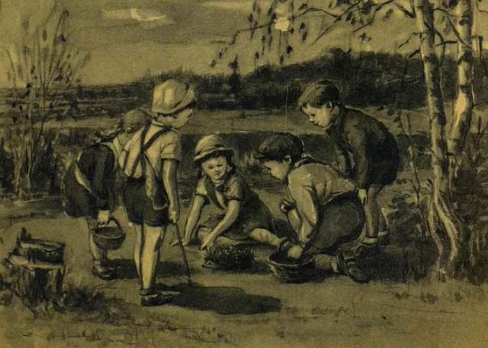 По всей вырубке пахнет земляникой и мёдом от белых мохнатых цветов и горячей смолой от высоких сосен. Кажется, будто где-то в лесу развели костёр и варят на нём душистое земляничное варенье. Бабочки, пчёлы, шмели носятся над цветами, садятся на них, пьют сладкий цветочный сок. А как весело посвистывают в кустах птицы, как звонко стрекочут в траве кузнечики, как хорошо кругом — прямо целый день не ушёл бы из леса! Пришли ребятишки на вырубку за земляникой. Она возле старых пней, возле кочек растёт. Подойдёшь к пеньку — а около него краснеют спелые, крупные ягоды. Такую ягоду надо сорвать осторожно: чуть покрепче в пальцах сожмёшь — она раздавится и так вкусно запахнет, что нет сил удержаться, чтобы не положить её в рот.