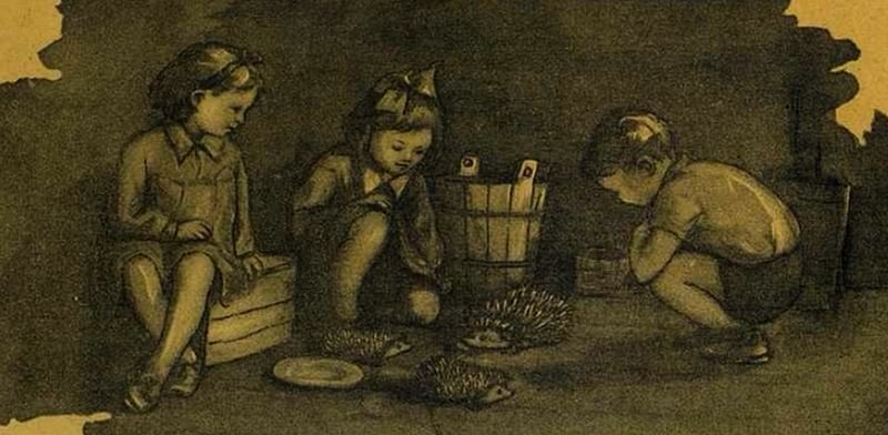 Дети подошли поближе, присели на корточки, чтобы лучше разглядеть её. Но ежиха, занятая едой, больше не обращала на них никакого внимания; а ежата всё суетились на том же месте, где прежде лежало мясо. Они нюхали пол и даже лизали его. Потом подбежали к блюдцу с молоком и стали совать в него свои носики. Им, видно, очень, хотелось есть, но лакать они ещё не умели.