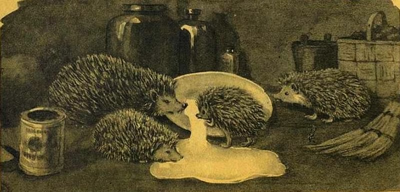 И вдруг самый бойкий из ежат забрался в блюдце и начал топтаться, мешая матери пить.