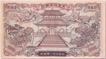 Предприимчивые китайцы, кстати, не ограничились только выпуском «денег ада». Среди последних серий нет-нет да и промелькнет купюра, которую, если верить надписям на ней, пустил в оборот уже не «адский», а «небесный» банк (Heaven Bank). На ней даже изображено это во всех отношениях высочайшее финансовое учреждение. Впрочем, и на таких экзотах проставлено наименование «деньги ада» (рис. 19). Но, скорее всего, заказчикам ритуальных денег подобные нюансы и несоответствия не мешают. Главное, что эти купюры, как и все остальные «деньги мертвых», прекрасно выполняют свою функцию, регулярно пополняя счета загробного мира.