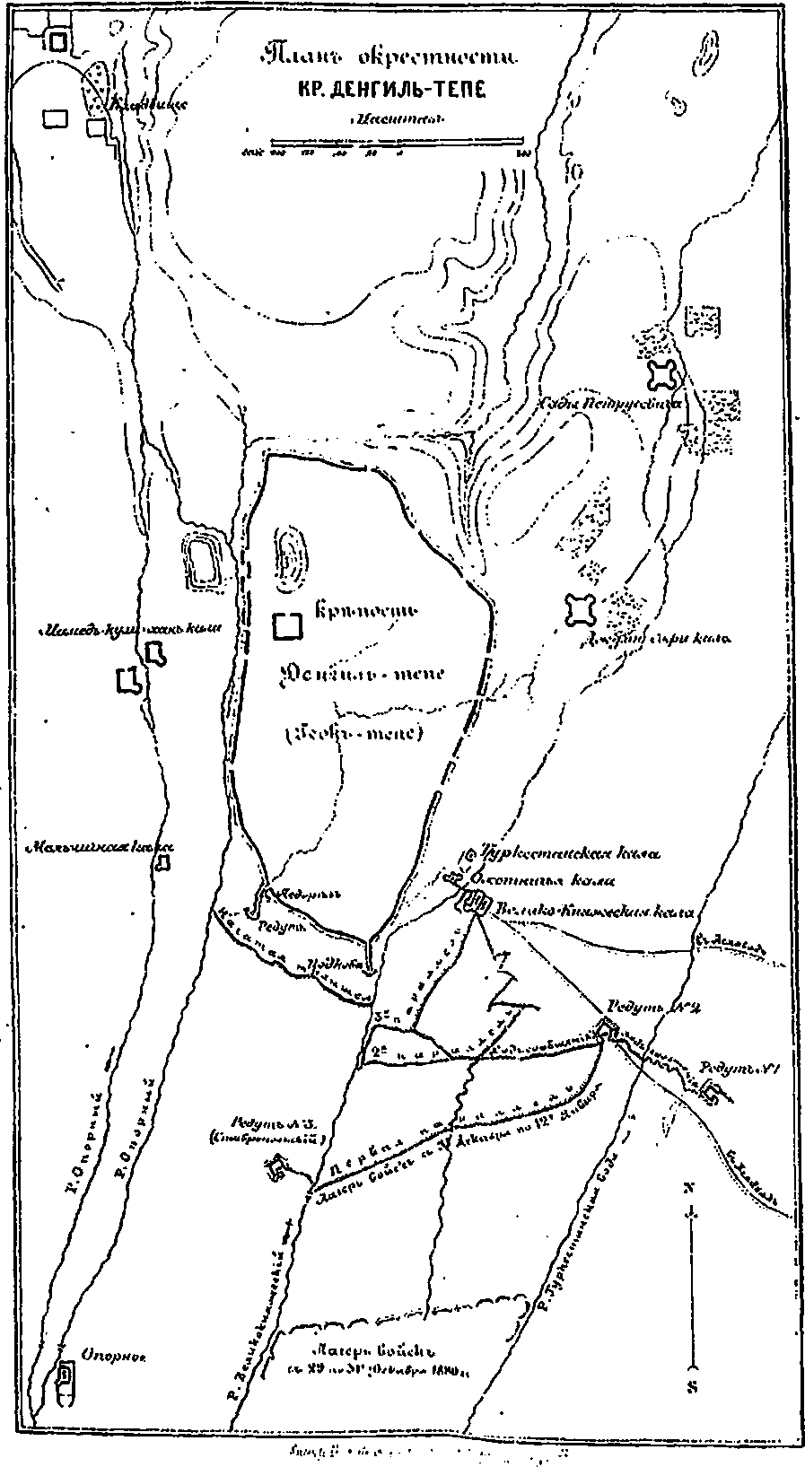 Въ основѣ плана общей аттаки Геокъ-Тэпе лежало первоначальное занятіе кишлака Янги-калы, долженствовавшаго служить исходнымъ и опорнымъ пунктомъ осады, для постепенной аттаки непріятельской крѣпости. 20-го декабря, войска дѣйствующаго отряда, въ 7 часовъ утра, построились передъ фронтомъ Самурскаго укрѣпленія, раздѣлившись на 3 части. Торжественная минута освящалась скромнымъ молебномъ…. Ряды вскорѣ заволновались… Командующій войсками, медленно объѣзжая часта войскъ, поздравлялъ ихъ съ наступающимъ боемъ. Объѣхавъ войска и сказавъ послѣднее слово начальникамъ частей, генералъ Скобелевъ отдалъ приказаніе "выступать". Первою двинулась вдоль горъ, къ ручью Секизъ-Ябъ, штурмовая колонна полковника Куропаткина, въ составѣ: 8 1/4 ротъ, 2-хъ сотенъ, 10-ти орудій и 2-хъ ракетныхъ станковъ. При колоннѣ—перевязочный пунктъ Краснаго Креста, завѣдуемый мною. Задача Куропаткина заключалась въ аттакѣ юго-восточной окраины Янги-калы. Спустя полчаса, должна была выступить колонна полковника Козелкова, въ составѣ: 8 1/2 ротъ, 3-хъ командъ[47]) и 10-ти орудій. Они вели. аттаку на сѣверную окраину Янги-калы. Съ этою-же колонной/ подъ личнымъ наблюденіемъ командующаго войсками, выступали и главныя силы, въ составѣ: 18 1/2 ротъ, 7-ми эскадроновъ и сотенъ и 32-хъ орудій. Направленіе главныхъ силъ было на крайній пунктъ лѣваго фаса сѣверной окраины кишлака, гдѣ находилась непріятельская кала, названная "Опорное". Какъ при колоннѣ Козелкова, такъ и при главныхъ силахъ, находились перевязочные пункты Краснаго Креста и военно-медицинскаго вѣдомства. За войсками слѣдовали: инженерный паркъ, лазаретъ Самурскаго баталіона на 20 мѣстъ, передовой лазаретъ Краснаго Креста на 150 мѣстъ и при немъ одноколки, фургоны и скады Краснаго Креста. Въ Самурскомъ укрѣпленіи оставались: 2 роты, 2 сотни и 19-ти орудій. Комендантомъ его назначенъ былъ войсковой старшина Верещагинъ. Колонна Куропаткина, въ своемъ движеніи до ручья Секизъ-Ябъ, сначала ограничивалась незначительной перестрѣлкой въ цѣпи, усилившейся во время переправы черезъ ручей, обрывистые берега котораго быстро соединили небольшимъ мостикомъ изъ взятыхъ съ собою фашинъ, лѣстницъ и пустыхъ зарядныхъ ящиковъ. Артиллерія, переправившись изъ первыхъ, немедленно заняла позицію и открыла усиленный огонь шрапнелью по непріятелю, наполнявшему изгороди и башни аттакованнаго кишлака. Подъ прикрытіемъ артиллерійскаго огня, зайдя правымъ плечомъ впередъ, колонна перешла въ наступленіе… Густой огонь непріятеля сталъ ослабѣвать… Онъ дрогнулъ и массы его быстро задвигались обратно въ Геокъ-Тэпе. На сѣверо-западной окраинѣ Янги-калы забѣлѣли густые клубы дыма, изъ которыхъ доносился рѣзкій гулъ орудійныхъ залповъ: это была аттака сѣверной окраины кишлака и калы "Опорное" — лѣво-фланговой колонной Козелкова. Часть тэкинской кавалеріи и часть пѣхоты оставались еще въ кишлакѣ и укрывались въ аррыкахъ, продолжая отстрѣливаться… Но, вотъ и онѣ бросились въ разсыпную въ крѣпость. На перерѣзъ инъ неслись двѣ сотни Таманскаго полка, подъ предводительствомъ войсковаго старшины графа Орлова-Денисова… Столкнулись… до 40 человѣкъ изрубили, остальные спаслись въ крѣпость. Обѣ колонны быстро занимали уже кишлакъ, заходя съ юга и съ сѣвера, и скоро соединились между собой. Минутъ черезъ 20 въ нимъ присоединились и главныя силы. Кишлак
