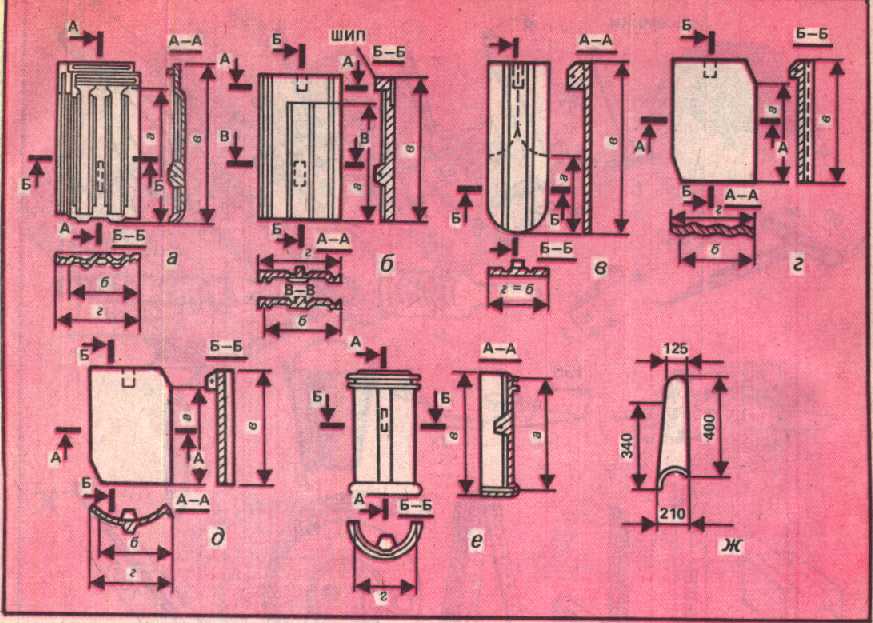 Рис. 9. Глиняная и цементнопесчаная черепица: а — пазовая штампованная; б — пазовая ленточная; в — плоская ленточная; г — волнистая ленточная; д — S-образная ленточная; е — коньковая; ж — желобчатая