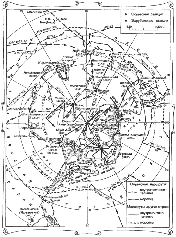 С окончанием МГГ исследования Антарктиды не прекратились: в самом конце 1958 г. «Обь» (капитан Александр Иосифович Дубинин) доставила в Мирный очередную, Четвертую антарктическую экспедицию (начальник Александр Гаврилович Дралкин, опытный полярник). Затем судно направилось на запад — к Берегу Принцессы Астрид — для строительства новой научной станции. В начале февраля «Обь» достигла заданного района, и сразу же выяснилось, что старые карты грешат большими ошибками: так, шельфовый ледник, получивший имя Лазарева, помещался на них почти на 100 км западнее. 10 марта в заливе, названном Ленинградский, начала работу станция Лазарев (69°58' ю. ш., 12°55' в. д.). Геологи под руководством Михаила Григорьевича Равича впервые исследовали центральную и восточную части гор Земли Королевы Мод. А еще дальше на востоке во время февральского полета они обнаружили свободные от льда и снега вершины гор, поднимающиеся до 2500 м, и назвали их Русскими. Летом 1959/60 г. группа советских полярников, в том числе географы А. Дралкин и Андрей Петрович Капица, прошла на мощных вездеходах от вспомогательной станции Комсомольской[18] через станцию Восток до Южного полюса и вернулась на Восток. Измерения толщины ледяного покрова на этом пути дали материал для уверенного вывода: в Восточной Антарктиде подо льдом приблизительно на уровне моря простирается громадная равнина, получившая имя Шмидта. (Позднейшие измерения позволили оконтурить это огромное — около 1 млн. км2 — понижение подледной поверхности; толщина льда над ним почти повсеместно превышает 3 тыс. м, а в центральной части составляет более 4 тыс. м. Кроме советских исследователей, вклад в открытие равнины Шмидта сделала австралийская экспедиция 1962 г.) А. Капица продолжил сейсмические и гравиметрические работы О. Сорохтина и довел до логического завершения открытие Ф. Беллинсгаузена и М. Лазарева, выявив покрытый льдами доледниковый материк. Зимовщики советской станции Восток 24 августа 1960 г. отметили самую низкую температуру на Земле — 88,3° С. Двумя годами ранее там же зарегистрировано — 87,4° С. Детальное изучение горной страны на Земле Королевы Мод, между 16° в. д. и 4° з. д., обнаруженной с воздуха А. Ричером, выполнил летом 1960/61 г. географ Владимир Игоревич Бардин. Он совершил с самолета 140 посадок на «белые пятна» региона, провел наземное маршрутное обследование территории, в частности описал массив Вольтат, горы Мюлиг-Хофман и Свердрупфьелла, выделив там ряд коротких хребтов. В 1961 г. к западу от станции Лазарев в шельфовом поясе обнаружены два залива (Дублицкого и Неупокоева), а у 0° — небольшой шельфовый ледник Беллинсгаузена. В июне 1961 г. вступил в силу Договор об Антарктиде, подписанный 1 декабря 1959 г. представителями 12 государств, в том числе СССР и США: Антарктида используется только в мирных целях; запрещаются любые ядерные испытания; провозглашаются свобода научных исследований и международное сотрудничество — обмен научным персоналом, результатами научных наблюдений и т. д. Материалы, собранные в 1962 г. советскими и зарубежными экспедициями, позволили обоснованно выделить пять новых морей, омывающих Антарктиду (от 0° к востоку до 113° в. д.): Лазарева, Рисер-Ларсена, Космонавтов, Содружества и Моусона. После дрейфа «Оби» зимой 1973 г. получены данные о четком отличии акватории между морями Д'Юрвиля и Росса; это при