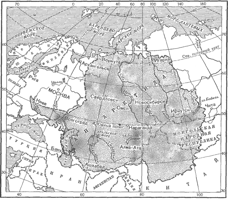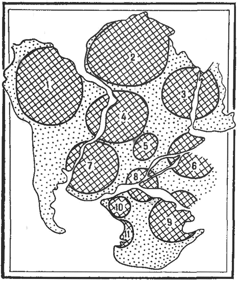 На Европейском материке М. Глуховский выделил Свеконорвежский (900 км)[45], Свекофеннокарельский (1300 км) и Кольско-Лапландский (550 км) нуклеары. Они приурочены к Скандинавскому п-ову и отдешифрированы по космическим снимкам. Прибалтийский (500 км), установленный им же по геолого-геофизическим данным и «с неба», занимает большую часть акватории Балтики. Скифский и Сарматский гиганты, с поперечником 1 тыс. км каждый, выявленные советским геологом Вильямом Артуровичем Бушем по геолого-морфологическим материалам, расположены в Европейской части СССР. Кроме перечисленных нуклеаров, в пределах континента В. Буш выделяет ряд крупных поднятий; к ним относятся Орденеское (около 600 км) на северо-западе Пиренейского п-ова с четырьмя довольно значительными сателлитами; Чешское (около 400 км), включающее Рудные горы, Чешский Лес, Шумаву и Су- деты; Паннонское (более 500 км), осложненное несколькими положительными и отрицательными структурами. На территории нашей страны он же отдешифрировал три овала диаметром от 300 до 400 км (с севера на юг) — Онежский, Молодечненский и Волынский и пять куполов (около 300 км в поперечнике) — Архангельский, Ленинградский, Тихвинский, Рыбинский и Горьковский. Из отрицательных структур заслуживают упоминания близкие по размерам (200–260 км) Сегурская (юг Испании), Лигуро-Пьемонтская (север Италии) и Парижская, а также более крупная Будапештская (до 400 км) и самая значительная (около 450 км) Мезенская. Южнее ее располагаются две структуры неясного генезиса — Сухонская и Вычегодская (обе до 400 км в поперечнике). В контурах этих крупных образований, а также вне их обнаружены многочисленные формы, диаметры которых обычно меньше 100 км.Кольцевые структуры Азиатской части СССР