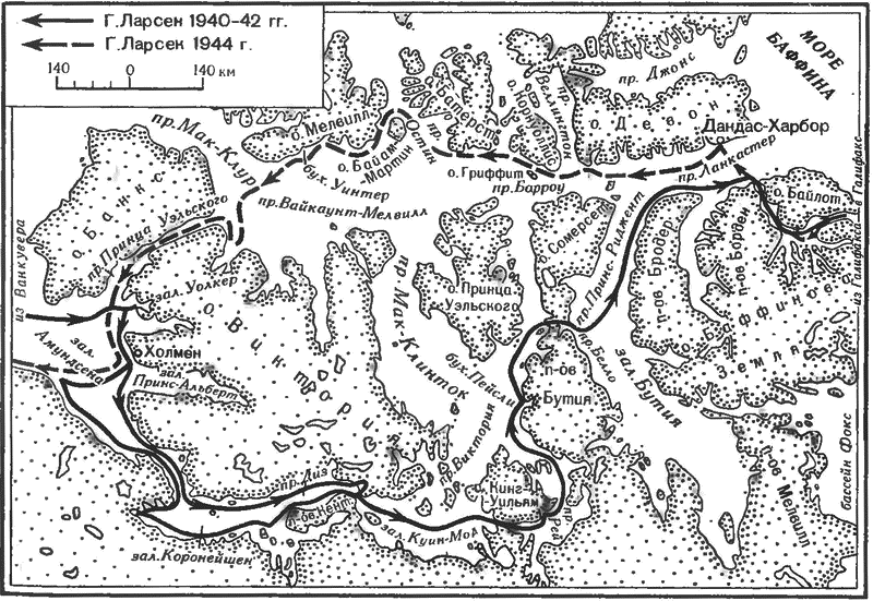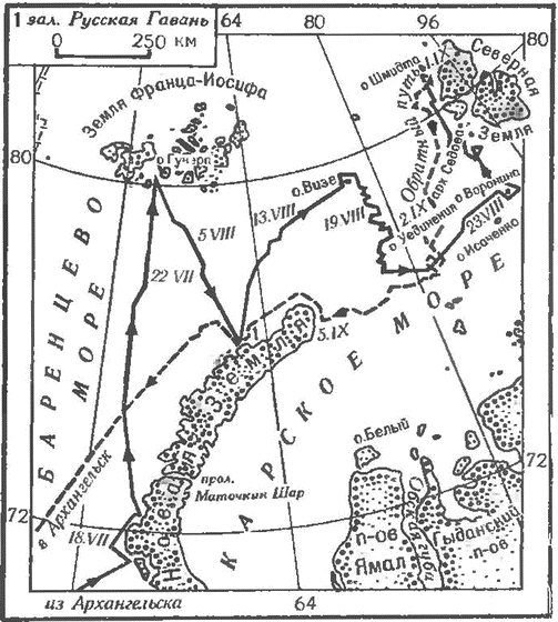 К началу 30-х гг. стало ясно, что использование Северного морского пути для регулярной связи между Европейским Севером и Дальним Востоком СССР вполне возможно. Оставалось только доказать на практике, что из Северной Европы можно пройти на Дальний Восток в одну навигацию. Это и совершила в 1932 г. экспедиция Арктического института под начальством О.Ю. Шмидта на ледокольном пароходе «Сибиряков» (водоизмещение 3200 т) под командой В.И. Воронина. Судно вышло из Архангельска 28 июля 1932 г., через Маточкин Шар прошло в Карское море и 3 августа 1932 г. достигло порта Диксон, где простояло до 11 августа, дожидаясь транспорта с углем. Оттуда корабль взял курс на Северную Землю и, идя по совершенно чистой воде, обнаружил на пути о. Сидорова (75°08' с. ш., 82°02' в. д.; название дано в честь военного гидрографа К.Е. Сидорова), положив тем самым начало открытию группы о-вов Арктического Института[23]. Затем «Сибиряков» обогнул с севера о. Комсомолец, причем достиг 81°28' с. ш., прошел в море Лаптевых до бухты Тикси, то но чистой воде, то преодолевая тяжелые льды. В конце августа он вышел из Тикси, взяв на буксир два колесных ленских парохода для перевода их в Колыму, довел их до устья Колымы и продолжал путь на восток. Многолетние торосистые льды «Сибиряков» встретил только за 167° в. д., близ Чаунской губы. Медленно пробивая себе путь через них, пароход добрался 10 сентября до о. Колючин (67°30' с. ш., 174°39' з. д.). Льды становились вся тяжелее, и здесь сломались все четыре лопасти винта. Потребовалось шесть дней, чтобы заменить их запасными. «Сибиряков» продолжал плавание к Берингову проливу, но через два дня, у 172° з. д. льдиной срезало вал винта с муфтой и лопастями; судно десять дней дрейфовало со льдами в различных направлениях. К счастью, 27 сентября подул северо-западный ветер и льды несколько разошлись. На «Сибирякове» поставили 11 парусов, частью сшитых из брезента, частью шлюпочных, он начал медленно продвигаться на юго-восток к кромке льда, за которой виднелось море, и 1 октября вышел на чистую воду у северного прохода в Берингов пролив. Несмотря на потерю восьми дней у Диксона и на две аварии у северного побережья Чукотского п-ова, «Сибиряков» впервые в истории прошел в одну навигацию Северный морской путь — от устья Северной Двины до Берингова пролива — в два месяца и три дня. Между тем к кромке льда несколько раньше подошел вызванный по радио советский траулер «Уссуриец», который отбуксировал пароход в Петропавловск, а затем в Иокогаму. Закончив здесь ремонт, «Сибиряков» 1 января 1933 г. вышел в море, обогнул с юга Азию и через Суэцкий канал, обойдя с юга и запада Европу, 7 марта прибыл в Мурманск.