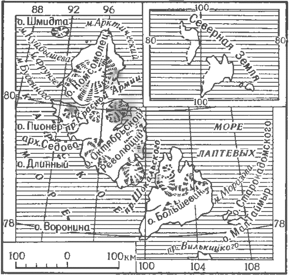 От новооткрытого острова «Седов» пытался пройтипрямо на восток, к не исследованной еще Северной Земле, где предполагалось высадить партию зимовщиков. Однако он встретил такие тяжелые плавучие льды, что вынужден был обогнуть их с юга. Только у 77° с. ш. удалось повернуть на северо-восток, и 22 августа открылись еще два низменных клочка суши, названные в честь участников экспедиции — микробиолога Бориса Лаврентьевича Исаченко и капитана «Седова» — о-вами Исаченко (77°15' с. ш., 89°30' в. д.) и Воронина (78°10' с. ш.. 93°45' в. д.). Затем экспедиция повернула на север, так как на востоке снова встретились непроходимые льды. На следующий день появился еще неведомый обрывистый западный берег Северной Земли, скованный невзломанным неподвижным льдом — широкой полосой берегового припая. А 24 августа, поднявшись на север вдоль В. К). Визе кромки льда до 79°30' с. ш., экспедиция обнаружила маленькую гряду — архипелаг Седова, в 40 км к западу от Северной Земли. За неделю на одном из островов (Домашнем) была построена полярная станция, где остались четыре зимовщика, включая начальника Г.А. Ушакова и геолога Николая Николаевича Урванцева. «Седов» двинулся далее на север, вдоль западного берега Северной Земли, в полосе между береговым припаем и плавучими льдами. Через день (31 августа) путь пароходу преградила широкая полоса мощного многолетнего льда, но в нескольких километрах севернее виднелась «огромная сверкающая белоснежная шапка с обрывистыми зеленовато-голубоватыми краями» (о. Шмидта, 81°10' с. ш., 91° в. д.). Оттуда «Седов» прошел на юг, а затем на запад и, обогнув с севера Новую Землю, прибыл 14 сентября в Архангельск. Гидрологические работы этой экспедиции в центральной части Карского моря положили начало очень важному океанографическому открытию: выявлены обширное мелководье, позднее названное Центральной Карской возвышенностью (глубины менее 50 м), и по обе ее стороны две подводные впадины — широкие глубоководные желоба: на западе — Св. Анны, на востоке — Воронина.Завершение открытия Северной Земли