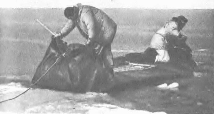 Попытки организовать на о. Врангеля англо-канадские зверобойные и китобойные промыслы предпринимались в годы интервенции и вторично в 1923 г. Инициатором в обоих случаях был Вильяльмур Стефансон, за которым стояли англо-канадские империалистические круги, рассчитывавшие, что они не встретят должного отпора со стороны молодого Советского государства. Однако они просчитались: чтобы положить конец попыткам захвата о. Врангеля, туда в июле 1924 г. была отправлена из Владивостока канонерская лодка «Красный Октябрь» под командованием военного моряка-гидрографа Бориса Владимировича Давыдова[21]. В 1919–1920 гг. он выполнил опись части западных берегов Берингова моря и на основе собранных материалов в 1923 г. издал «Лоцию побережий РСФСР, Охотского моря и восточного берега полуострова Камчатки…». Кроме основного поручения от Советского правительства, Давыдов выполнял еще задание научно-исследовательского характера как на пути к о. Врангеля — в Беринговом проливе и в Чукотском море, так и у самого острова. Продвигаясь до 12 августа 1924 г. на север через Берингов пролив и южную часть Чукотского моря, совершенно свободные от льда, экспедиция достигла 70°43' с. ш. Но когда «Красный Октябрь» повернул на запад к о. Врангеля, он встретил тяжелые льды, был зажат ими, четыре дня дрейфовал и еще два дня с большим трудом в густом тумане пробирался через торосистые многолетние льды. 19 августа первые советские моряки высадились на южный берег о. Врангеля (у бухты Роджерса), и на следующий день в торжественной обстановке Давыдов поднял там советский флаг и установил медную доску с датой посещения острова. Три дня «Красный Октябрь» шел на запад вдоль побережья и обнаружил два промысловых зимовья с небольшими складами, а вскоре и людей: одного канадца и 13 американских эскимосов, заброшенных туда в 1923 г. для хищнического промысла. Давыдов конфисковал все промысловые орудия и добычу, а промышленников, как браконьеров, арестовал. Закончив осмотр и съемку южного берега о. Врангеля, Давыдов 23 августа повернул от юго-западного мыса Блоссом к материку. Он достиг его у мыса Якан только через пять дней, так как пролив Лонга был забит льдом. Оттуда «Красный Октябрь» короткое время шел на юго-восток по береговой полынье до мыса Шмидта, всего лишь около 150 км. Здесь ледовая обстановка так ухудшилась, что моряки стали готовиться к зимовке, но через четыре недели, когда уже разобрали машину, вдруг почувствовали зыбь. Она все усиливалась — очевидно, неподалеку часть моря была свободна от льда. Менее чем в два дня машину снова собрали, развели пары, и 27 сентября «Красный Октябрь», преодолев полосу льда шириной приблизительно в 25 км, по чистой воде при противном штормовом ветре двинулся к Берингову проливу, но только через шесть дней добрался до мыса Дежнева. Раздобыв в этом районе немного топлива, экспедиция прошла через Берингов пролив и 6 октября остановилась в бухте Провидения, где угля для корабля оказалось достаточно. 23 октября 1924 г. «Красный Октябрь», успешно выполнив правительственные задания, вернулся во Владивосток. В августе 1926 г. пароход «Ставрополь» под командой Павла Георгиевича Миловзорова доставил из Владивостока на о. Врангеля первую партию советских переселенцев (59 человек) во главе с Георгием Алексеевичем Ушаковым, назначенным начальником острова. А на обра