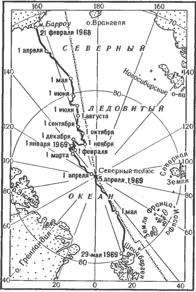 В июне погода ухудшилась — тучи заволокли небо, снег стал глубоким и липким, чаще попадались разводья и трещины; иногда приходилось превращать нарты в лодки — и темп похода упал до 3 км в день. В начале июля Херберт достиг 82°27' с. ш., 1бЗ°30' з. д., но о дальнейшем продвижении до наступления осени нечего было и думать. Пришлось разбить летний палаточный лагерь, получивший название «Тающий город». В нем группа прожила до 4 сентября. Вскоре после вторичного старта один из четверки, споткнувшись, неудачно упал, повредил позвоночник и растянул связки. Поиски подходящей для вынужденной зимовки льдины затянулись до 15 сентября — прежняя для этой цели была уже не пригодна. В начале ноября зимовщики находились на 85°48' с. ш., 164°20' з. д., а к концу месяца дрейф сместил их на 160 км к юго-востоку. Время они коротали в сборах метеорологических, гляциологических и геофизических материалов и в уходе за больным. На родине, в Великобритании, и далеко за ее пределами судьба их внушала беспокойство — об этом красноречиво свидетельствовала многочисленная корреспонденция. А одна престарелая женщина из США трогательно-наивно спрашивала в письме: «Кто придумал для вас, ребятки, эту экспедицию?» Грохот ломающейся льдины в конце февраля 1969 г. возвестил о начале нового этапа похода. Херберт и его спутники, включая пострадавшего, поставленного на ноги заботливым уходом, направились к полюсу. Ориентироваться приходилось только по Венере: солнце и луна на небосклоне еще не появлялись. Морозы достигали 48° С. «Холод был поистине нестерпимым. Мы, казалось, промерзали насквозь. Часто мы бывали отчаянно голодны и испытывали сильную жажду, но не могли останавливаться днем, чтобы разбить палатку. Примерно с 8 утра до 8–9 вечера мы не ели и не пили ничего горячего, а к концу тяжелого перехода просто заваливались в спальные мешки и быстро засыпали» (У. Херберт). Постепенно морозы стали ослабевать, а после того, как выглянуло солнце, путешественники проводили в движении все больше и больше времени. Улучшилось и качество «дороги» — впервые они шли по твердому снегу, уплотненному ветром. 5 апреля группа достигла Северного полюса. «Какой был день — воскресенье, суббота? А может быть, понедельник? Здесь этих понятий не существовало. Мы сильно устали после изнурительных переходов… за последние шесть недель» (У. Херберт). В конце апреля четверка достигла района очень подвижного льда и едва не лишилась одной упряжки. Трещины и разводья препятствовали им двигаться прямо на юг — приходилось совершать «обходные маневры». За день нарты многократно проваливались в лужи — и все же именно этот этап маршрута отличался наиболее продолжительными дневными переходами. С начала мая — на Северном Ледовитом океане это месяц частых туманов — группа двигалась в белесой мгле, проваливаясь в невидимые ямы. А 29 мая, пройдя около 5600 км по льду и выполнив первое полное пересечение океана по его большой оси, они вышли к скалистому островку из группы Семи Островов у северо-восточного побережья Шпицбергена. Переправив всех собак и снаряжение вертолетом на борт британского судна, Херберт завершил экспедицию 10 июня. За время трансарктического перехода четверка почти ежедневно измеряла толщину льда и плотность снега, изучала топографию ледяной поверхности и условия жизни полярной фауны, собирала данные