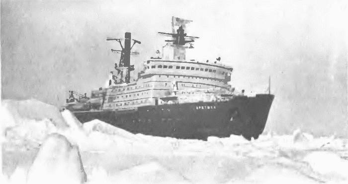 Попытки пройти на судах через Полярный бассейн предпринимались, как мы уже отмечали (см. т. III, гл. 17), с 60-х гг. XVIII в. Однако заканчивались они неудачей: преодолеть многолетние мощные ледяные поля не смогли ни парусные корабли и пароходы, ни ледоколы и дизель-электроходы. Лишь с появлением атомных ледоколов проблема покорения Центральной Арктики превратилась в реальную задачу. Впрочем, располагать такими гигантами еще не значит справиться со всеми трудностями и сюрпризами высоких широт, — необходимы достоверные данные о природных условиях этой огромной акватории. А они могут быть получены — и были собраны — в результате многолетней кропотливой исследовательской работы. В 1976 г. сотрудники Института Арктики и Антарктики, проанализировав имеющиеся материалы, подняли вопрос об организации высокоширотной экспедиции через Полярный бассейн к Северному полюсу на атомном ледоколе. Но по прогнозу к осени ожидались не совсем благоприятные условия, и поход пришлось отложить до осени следующего года. 9 августа 1977 г. атомный ледокол «Арктика»[27] (руководитель экспедиции Тимофей Борисович Гуженко, капитан Юрий Сергеевич Кучиев) отправился в плавание из Мурманска. Обогнув северную оконечность Новой Земли, он двинулся на юго-восток через перемычки дрейфующего разреженного льда и, не снижая скорости, прошел проливом между о-вами Арктического Института и о. Свердруп. Далее корабль следовал обычной трассой на восток-северо-восток, 13 августа проник в море Лаптевых через пролив Вилькицкого и за 120° в. д. повернул на северо-северо-восток. Утром 14 августа «Арктика» подошла к границе сплоченных льдов и взяла курс прямо на север. На следующий день, оставив к югу 85° с. ш., атомоход начал активное плавание во льдах Арктического бассейна, куда надводные корабли попадали только дрейфуя. Скорость снизилась до 18,5 км/час и по мере увеличения количества «сибиряка» — многолетних зеленоватых льдов, формирующихся к северу от побережья Сибири — продолжала падать. Поля с торосами «Арктика» форсировала напролом, продавливая своей массой; в ряде случаев при заклинивании приходилось прибегать к раскачиванию огромного судна с целью освобождения из ледовых объятий.