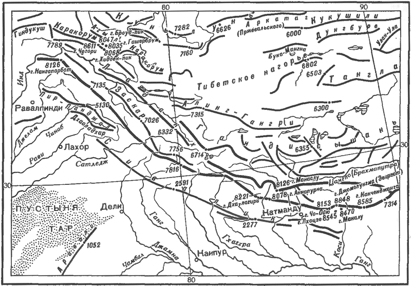 Горы, высота которых превышает 8 км, называются «восьмитысячниками». В настоящее время в Гималаях их выявлено десять, в Каракоруме — четыре. Впрочем, ряд исполинов имеет по две, три и даже четыре вершины, поднимающиеся выше 8 км, и, таким образом, общее число их достигает 23. Полная драматизма история покорения восьми километровых великанов состоит из трех этапов. На первом (до 1950 г.), разведочном, проводились обследования подступов к гигантам, детальное изучение прилегающих к ним районов и неудачные попытки восхождения, иногда сопровождавшиеся гибелью альпинистов и носильщиков. Второй этап, победоносный (1950–1964), начался 3 июня 1950 г.: француз Морис Эрцог с одним спутником впервые в истории альпинизма покорили «восьмитысячник» — Аннапурну («Богиню урожая»), сильно заснеженную громаду, высшую точку (8078м) небольшой горной цепи в восточной части Центрального Непала. Плата за этот сенсационный успех — ампутация пальцев на руках и ногах горновосходителей. Главный результат победы — преодолениепсихологического барьера так называемой «зоны смерти», проходящей на высоте более 7500 м: здесь у многих альпинистов наблюдалось падение физических сил и наступала душевная депрессия. После того как Э. Хиллари и Н. Тенцинг одержали победу над Эверестом, австриец Герман Буль 3 июля 1953 г. в одиночку взошел на Нангапарбат, высшую точку Западных Гималаев, — огромный массив с крутыми склонами и обширным оледенением, поднимающийся на 8126 м и окруженный несколькими вершинами более 7000 м. За полувековой период при многочисленных попытках восхождения на эту гору-«убийцу», «Голую гору ужасов» с четырьмя ледниками, производящую весьма внушительное впечатление, погиб 31 альпинист. В 1954 г. человеку покорились также две вершины. На могучий (8611м) заснеженный массив Чогори («Большая гора») в хребте Каракорум 31 июля поднялись два итальянца — Ахилле Компаньоне и Нино Лачаделли. Цена победы над этим гигантом с крутыми (кроме северного), труднопроходимыми склонами — жизнь одного из 12 участников экспедиции, руководимой геологом Ардито Дезьо. Снежно-ледовый купол Чо Ойю («Бирюзовая богиня», 8153 м) 19 октября не устоял перед австрийцем Гербертом Тихи и его двумя спутниками. В 1955 г. вновь два гиганта склонили головы перед мастерством, мужеством и взаимовыручкой людей. 15 мая на острую, как игла, главную вершину четко очерченного ребристого пика Макалу («Черный великан», 8470м) совершила восхождение группа французов во главе с Жаном Франко. А через 10 дней четверо британцев во главе с Джорджем Бендом праздновали победу над Канченджангой (8585 м), самым южным и в то же время наиболее восточным великаном планеты (27°42' с. ш., 88°09' в. д.). Этот горный массив со многими вершинами и пятью ледниками («Пять сокровищниц великих снегов») почитается священной горой — вот почему первовосходители, чтя религиозные чувства местных жителей, не стали преодолевать последние метры до вершины. 1956 г. оказался рекордным — побеждены три «восьмитысячника». В начале мая четверка японских альпинистов во главе с Тошио Иминиши поднялась на Кутанг (8126 м). Эта заснеженная гора (другое название Манаслу — «Душа»?), по форме напоминающая острый клык, господствующий над окружающими вершинами, расположена в Центральном Непале, в слабо исследованном районе. 18 мая на Лхоцзе («Южный пик», 8545 м) взошли два швейцарца — Эр