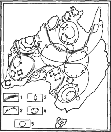 1 — нуклеары, 2 — овалы, 3 — купола, 4 — поднятия, 5 — депрессии;