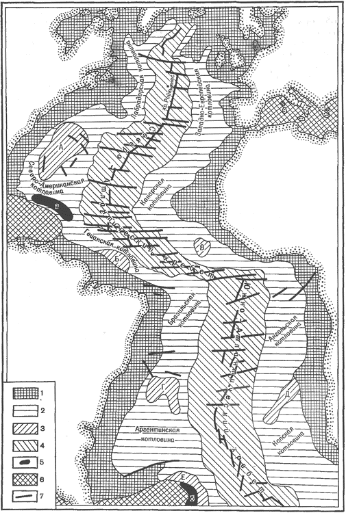 4 — срединноокеанический хребет, 5 — глубоководные желоба (а — Пуэрто-Рико, б — Южно-Сандвичев), 6 — другие структуры переходных областей, 7 — разломы